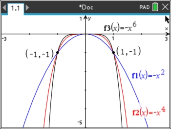These 3 graphs intersect with one another at the points (-1,1) and at (1,1).