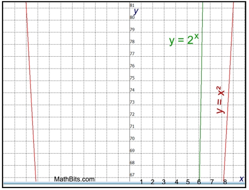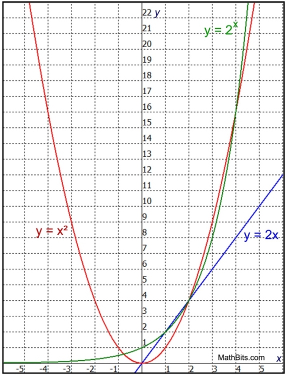 • Then at x = 2, the quadratic exceeds the exponential and the linear.