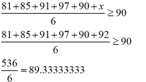 • In a word problem, such as this, it would be unnecessary to "solve" the inequality to isolate x on one side of the inequality symbol. Since only ONE situation is going to be examined, it will be faster to simply substitute the number 92 into the existing inequality to determine the result.
