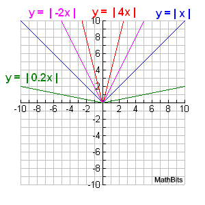 • In this situation, if the coefficient of x is negative, the graph is the same as if that coefficient were positive. The coefficient is acted upon by the absolute value property of multiplication: