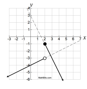 In addition, the graph is a "function", since any vertical line drawn in the interval from -2 to 5 will intersect the graph only once. Notice at x = 2 that we have an open circle and a closed circle, allowing for a vertical line to intersect only the Part 2 section of the graph.