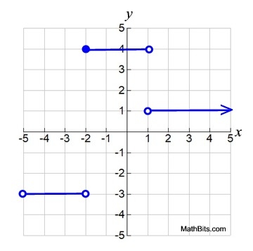 Notice the problem at x = 1. Since both endpoints are open circles, there is NO plotted value at x = 1. This opening must be noted in the statement about the domain of the entire function: