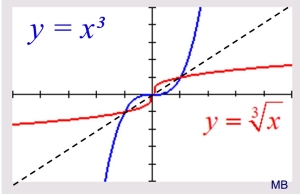 2. but, in the same fashion as the square root function, the cube root function is the inverse of the cubic function. The cube root function and its inverse (the cubic function) are reflections of one another over the line y = x. |