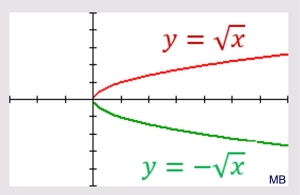 If we reflect the square root function over the x-axis, the two graphs put together form a parabola. The equation of this sideways parabola will be y2 = x. |