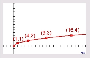 Notice that the columns of values have "switched places" between the quadratic function (on the left), and the square root function (on the right). The x and y values have "swapped" positions. Remember, "squaring" and "square rooting" are inverse operations. |