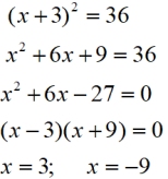 We saw this example under the "factoring method" in the section above. Here it is again, being solved by the "square root method". Of course, the answers are the same.
